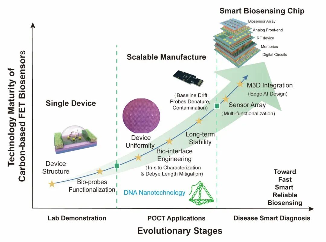 碳基场效应晶体管(FET)生物传感器因其具有高灵敏度、响应迅速、低功耗及易集成等优异特性,在即时检测(POCT)领域具备极高的应用价值与广阔前景。然而,该类传感器从实验室研究走向稳定可靠的体外诊断实用工具,需推动研究范式从单纯追求极限灵敏度,转向兼顾长期稳定性、操作可靠性及规模化制造能力的综合性能提升。DNA纳米技术凭借其独特的原子级可编程特性,为碳基FET生物传感器的界面工程优化提供了全新解决方案,有助于实现传感界面的低成本构建、长期稳定性和高批次一致性。DNA纳米技术与碳基FET生物传感技术的协同融合,有望有效弥合实验室基础研究与大规模临床应用之间的技术鸿沟。