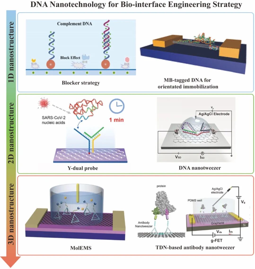 近日,北京大学电子学院张志勇教授-肖梦梦副研究员团队,系统梳理了DNA纳米技术在碳基FET生物传感器界面工程中的最新研究进展。团队对DNA纳米结构按维度进行了系统分类,深入剖析了不同维度DNA纳米结构在优化碳基FET生物传感界面、提升传感核心性能中的协同作用机制,重点阐释了DNA纳米技术在解决碳基FET生物传感器临床转化关键挑战中的潜在应用价值,为该领域后续的基础研究与产业化技术开发提供了全面、关键的参考依据。
