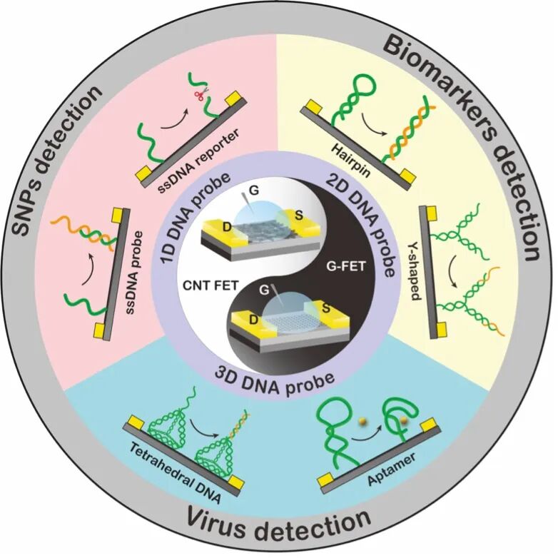 图1. 基于DNA纳米技术界面工程的碳基FET生物传感器的关键组成和应用领域