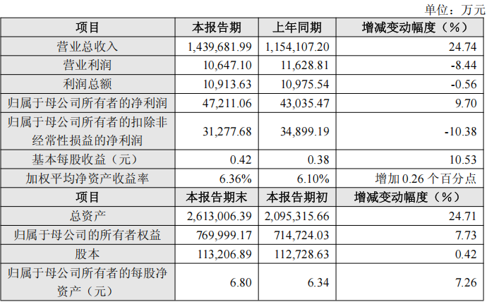 盈利能力指标方面,基本每股收益为0.42元,较上年同期增长10.53%;加权平均净资产收益率为6.36%,较上年同期增加0.26个百分点。