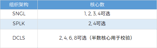 为满足客户多样需求,R520A提供三种顶层架构结构:SNGL(多核)、SPLK(多split-lock核)、DCLS(多lock-only核)。在DCLS架构下最多可支持4个ASIL-D核心,在SPLK架构下最多可支持2个ASIL-D核心或4个ASIL-B核心,三种架构下核心数量可配。