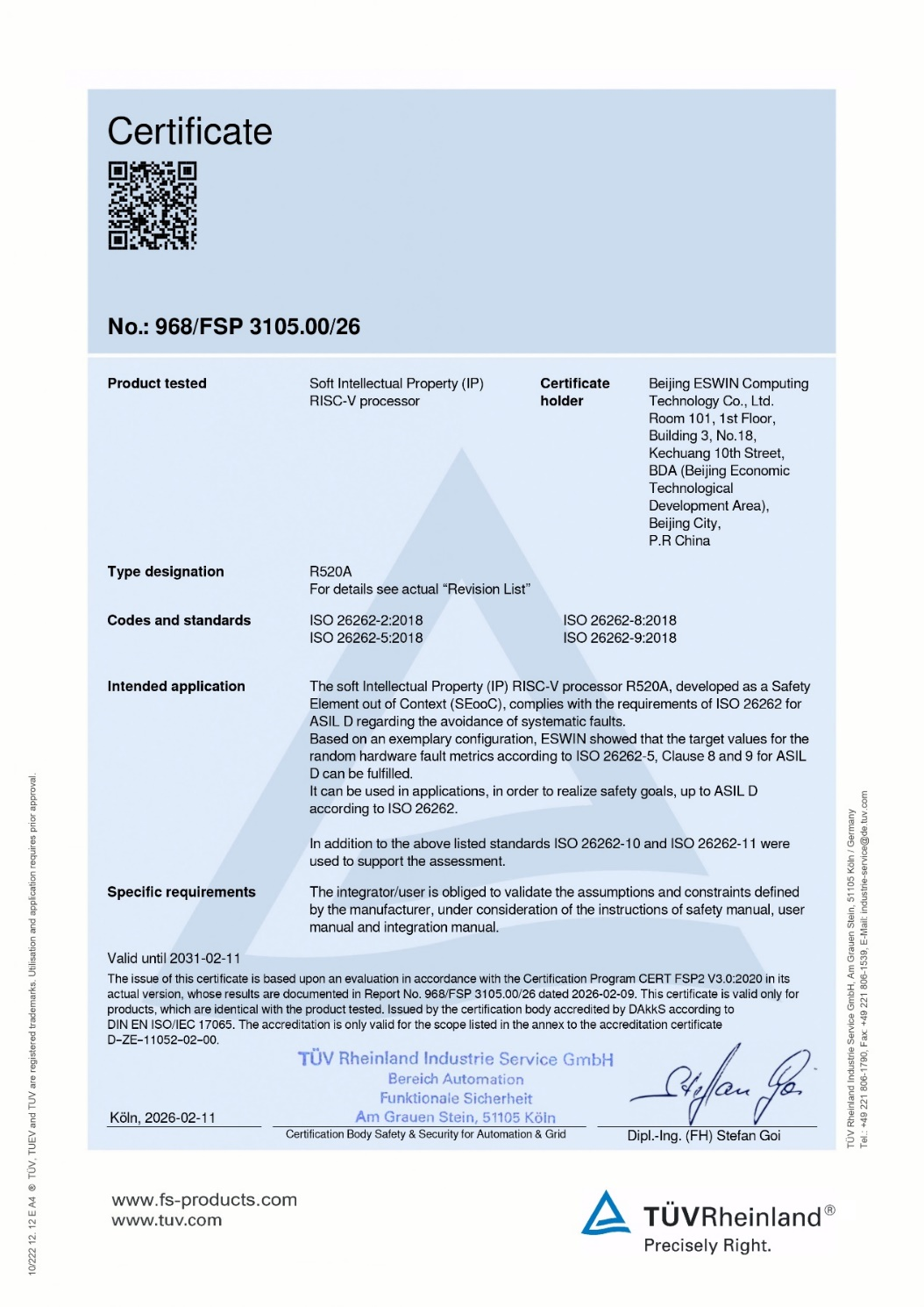奕斯伟计算自研RISC-V CPU IP——R520A ASIL-D功能安全认证证书