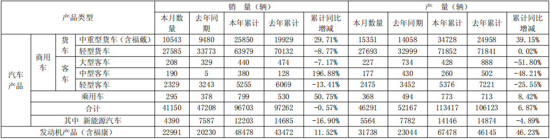 另外,发动机产品(含福田康明斯)2月销量22,991台,本年累计销量48478台,累计同比增长11.52%。其中,福田康明斯(福康)发动机2月销量14,094台,累计销量28,831台,累计同比小幅下降1.84%。