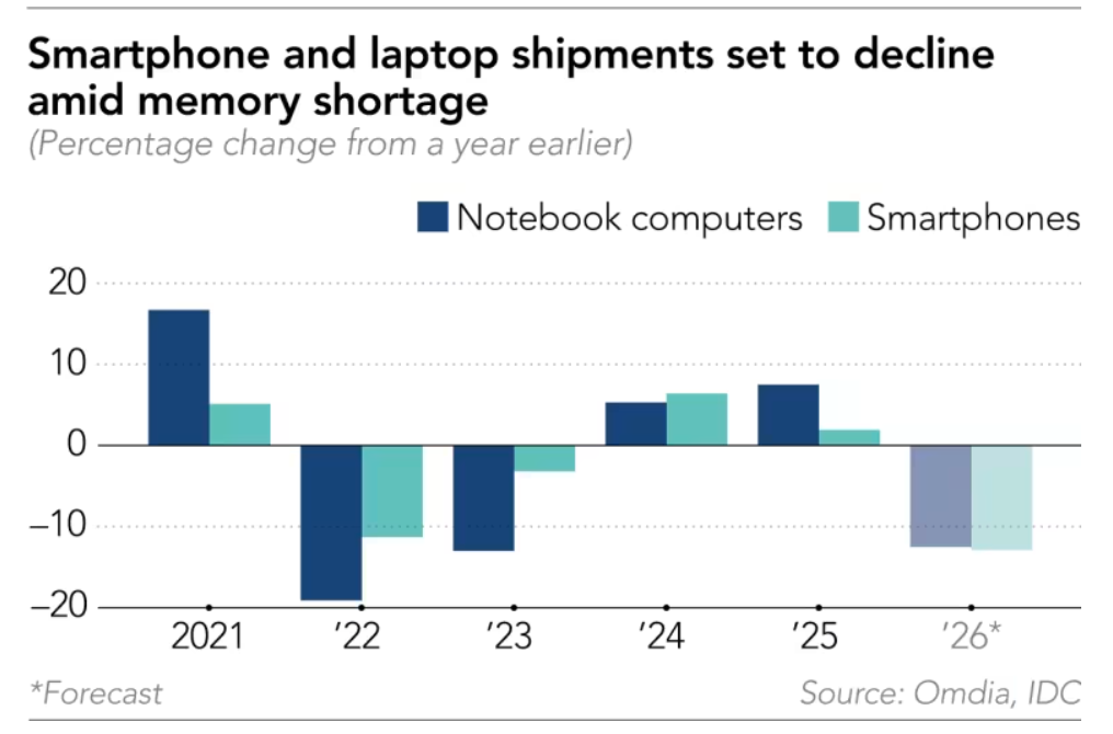 “内存芯片短缺和价格上涨对行业造成了双重冲击。这可能导致今年全球个人电脑出货量下降……我不敢对2026年做出预测,因为就连我们的客户都不确定该如何估算,”纬创资通首席执行官林建勋近日对记者表示。纬创资通主要生产中高端和商用个人电脑。