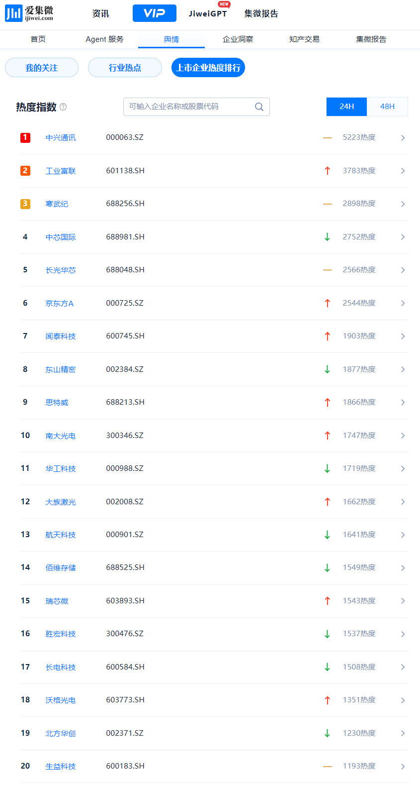 登录爱集微VIP频道,实时查看动态“上市企业热度排行”,穿透洞察每一个波动背后的驱动因素。