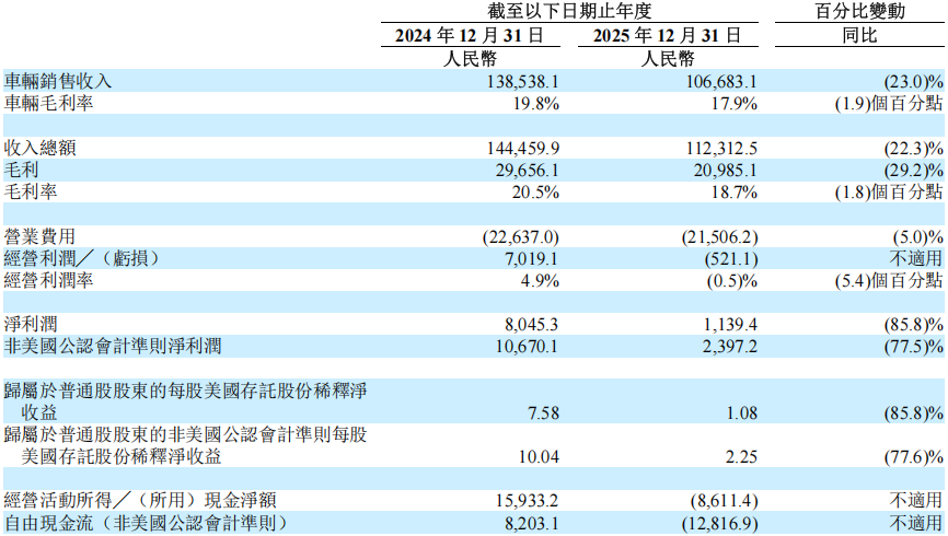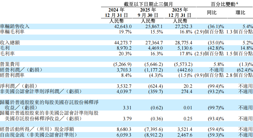 第四季度表现回暖,单季交付新车109,194辆,环比增长17.1%;营业收入288亿元(约41亿美元),环比增长5.2%;实现净利润2024万元(约290万美元),较第三季度净亏损6.24亿元实现扭亏;非美国公认会计准则净利润2.74亿元(约3920万美元),同样扭转三季度亏损局面。经营活动所得现金净额35亿元,自由现金流25亿元,均由负转正,现金流状况显著改善。