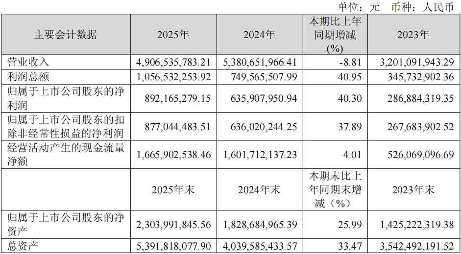 2025年,亚翔集成实现营业收入49.07亿元,虽同比下降8.81%,但盈利水平显著增强。其中,归属于上市公司股东的净利润达8.92亿元,同比增长40.3%;归属于上市公司股东的扣除非经常性损益净利润8.77亿元,同比增长37.89%;基本每股收益4.18元,同比增长40.27%,创历史新高。