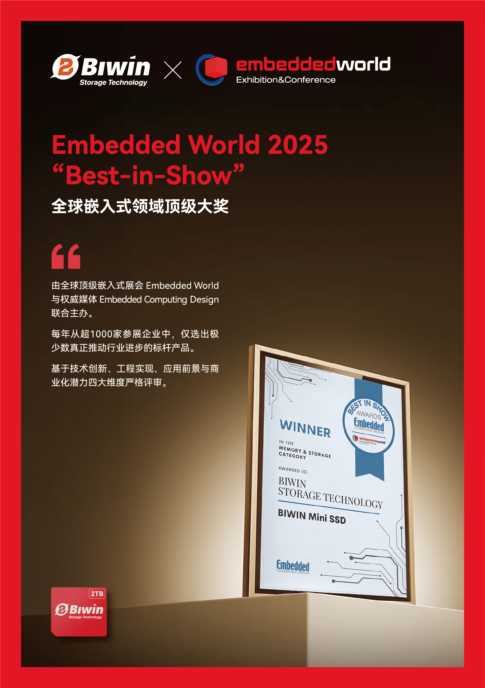 Embedded World 的 “Best-in-Show” 是嵌入式系统领域最具权威性的奖项之一,由一线工程师与行业专家基于产品性能、可靠性及实际应用价值等维度综合评定。Mini SSD 获此殊荣,标志着其在专业圈层获得了深度认可,印证了其在嵌入式场景应用中的技术成熟度与应用前景。