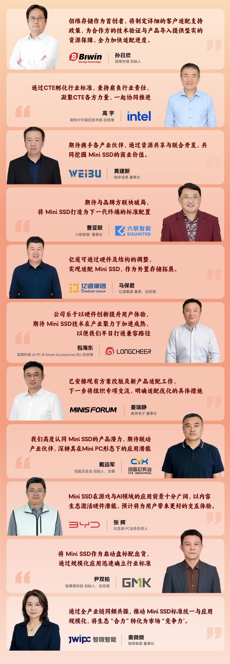 从顶层设计的利益共享,到技术导入的联合攻关,再到终端市场的价值变现,此次会议达成的三项共识,不仅为 Mini SSD 的后续发展注入了强劲动能、打开了广阔空间,更构建了一个开放、共赢、可持续的产业生态闭环。