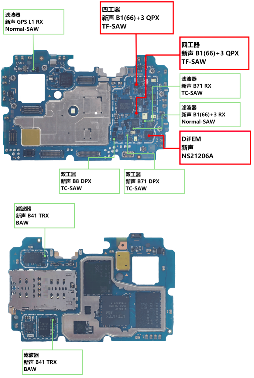 其次,是对射频物理禁区的双向突破。在 X6D 的主板上,新声量产交付了基于 TF-SAW 工艺的 B1(66)+3 QPX 四工器。四工器需要将两路发射与两路接收信号强行压缩进一颗微小晶粒内,对带外抑制和频段隔离度提出了极高的物理要求。同时,针对海外严苛网络环境,新声提供了具备高稳定温度补偿特性的 B8 DPX 和 B71 DPX(TC-SAW 工艺),完美解决了复杂网络下的温漂问题。