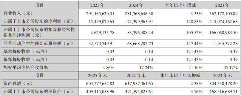 3月17日,世纪鼎利发布2025年年度报告。报告显示,公司全年实现营业收入2.91亿元,同比增长3.33%;归属于上市公司股东的净利润为1549.91万元,较上年同期的-7,439.99万元增长120.83%,成功实现扭亏为盈。归属于上市公司股东的扣除非经常性损益的净利润为462.91万元,同比增长105.52%。