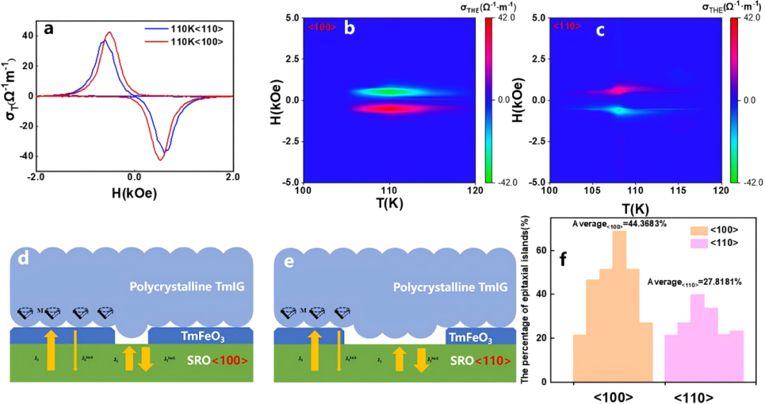 图2 不同电流取向下的THE电导率及其作用机制。a. 电流沿 <100> 与 <110> 晶向时的拓扑霍尔效应电导率;b. <100 > 晶向对应的拓扑霍尔效应电导率等高线图;c. <110> 晶向对应的拓扑霍尔效应电导率等高线图;d、e. <100> 晶向与 <110> 晶向的结构示意图,界面处包含 TmIG 中的手性自旋织构;f. <100> 与 <110> 晶向的外延岛占比统计结果。