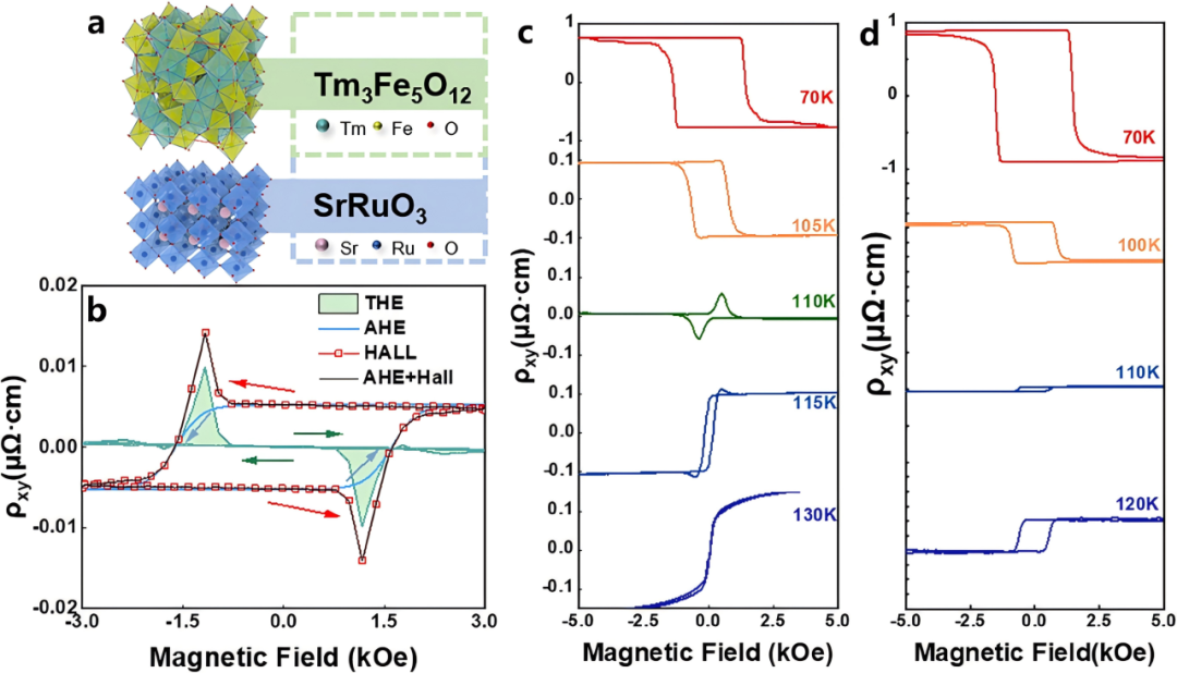图1 生长在 STO (100)/SRO (6 nm)/TmIG (6 nm) 双层中的拓扑霍尔效应。a. SRO 与 TmIG 的晶体结构示意图;b. 110 K 温度下测得的霍尔电阻率,以及拟合得到的反常霍尔效应(AHE)曲线;c. 不同温度下,双层的霍尔电阻率随外加磁场的变化关系;d. 单层 SRO 薄膜的霍尔电阻率测试结果。