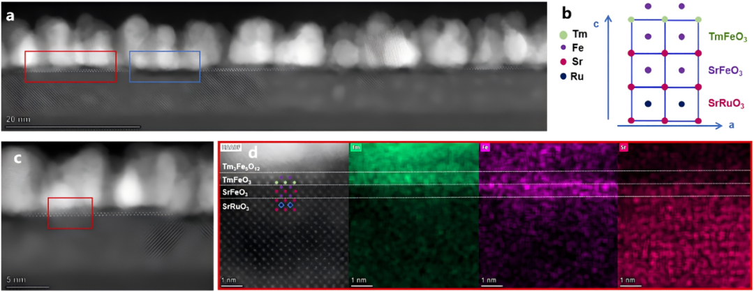 图3基于高分辨透射电子显微镜(HRTEM)的界面元素表征。a.透射电子显微镜(TEM)图像;b. 外延岛晶体结构的示意图;c、d. 外延岛的原子相图像,以及对应的透射电子显微镜EDS表征结果。