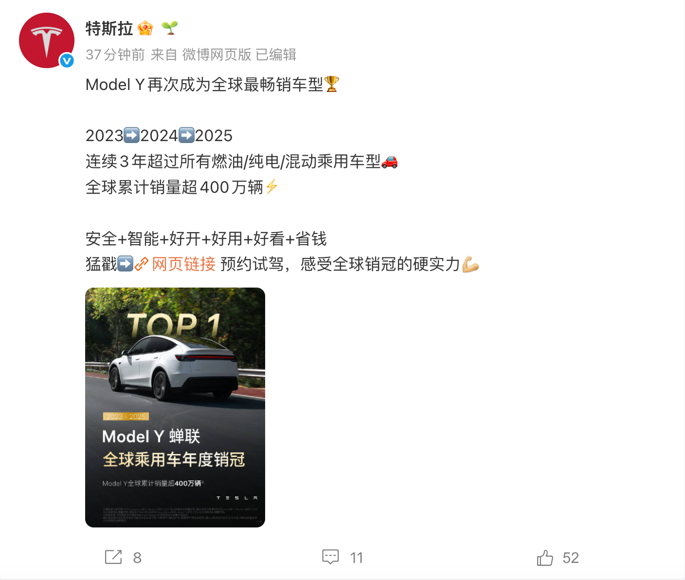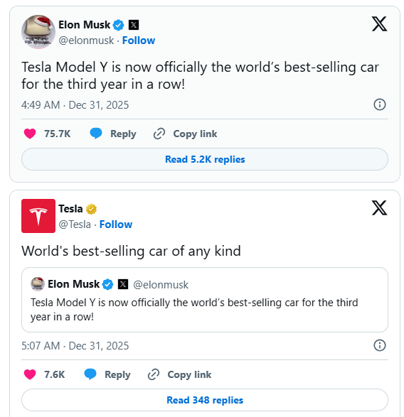 去年的12月31日,马斯克在X上发文:“特斯拉Model Y现已正式连续第三年成为全球最畅销汽车。”随后,特斯拉官方账号转发了该条内容,并附文强调其“全球最畅销车型”的地位。