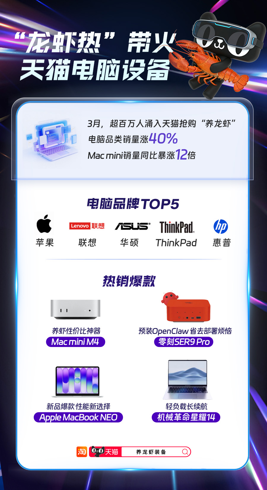 3月20日,近期OpenClaw“养龙虾”AI智能体部署需求持续升温,带动相关电脑硬件设备销量大幅上涨。3月以来,已有超百万人涌入天猫选购“养龙虾”部署设备,推动平台电脑品类整体销量环比增长40%。