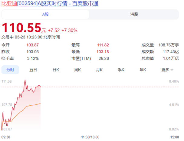 3月23日,比亚迪A股、港股股价均开盘高走,其中A股一度涨超8%,截至发稿股价为110.55元/股,总市值重回万亿市值,达1.01万亿元,港股为106.7港元/股,总市值为9728亿元。