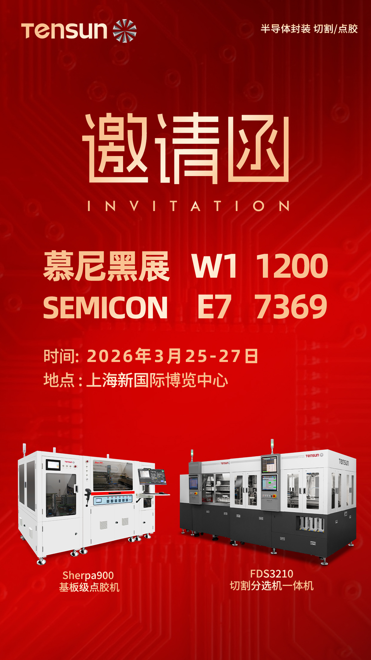 3月25日-27日,上海新国际博览中心,腾盛精密E7-7369、W1-1200双展位静待诸君莅临。让我们共赴这场行业盛宴,共探先进封装技术前沿,共话精密制造产业未来,见证国产设备的崛起与荣光!
