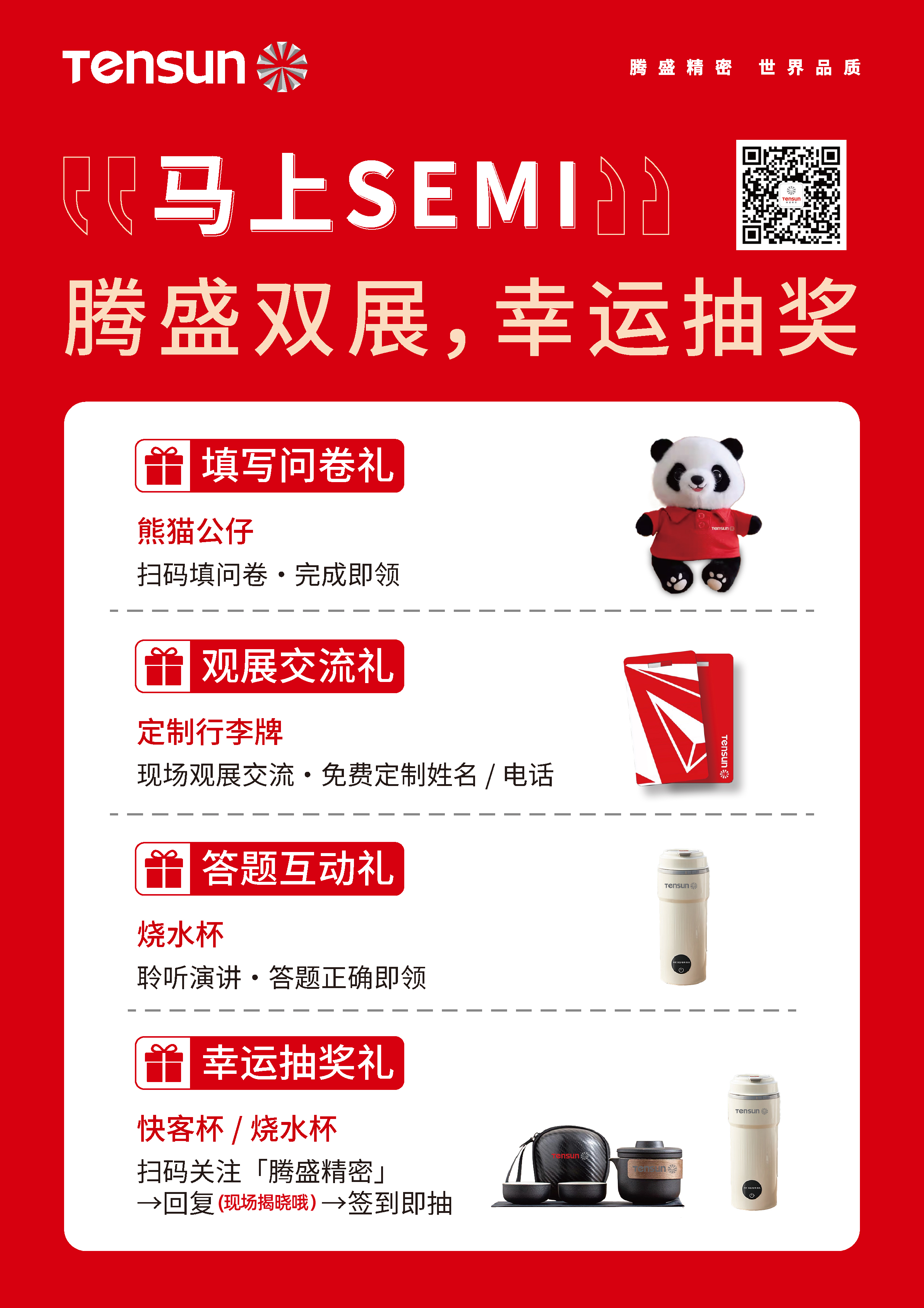 【幸运抽奖礼】扫码关注「腾盛精密」公众号,回复关键词(现场揭晓哦),完成签到即可参与抽奖,有机会赢取精致快客杯、高端烧水杯,多重好礼随机派送。
