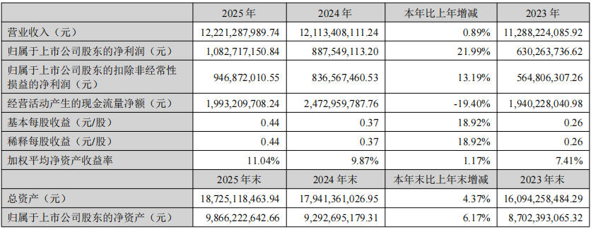 大洋电机3月23日发布2025年年度报告。报告显示,公司2025年实现营业收入122.21亿元,同比增长0.89%;归属于上市公司股东的净利润为10.83亿元,同比增长21.99%;扣非净利润为9.47亿元,同比增长13.19%,营业收入及利润水平均创历史新高。