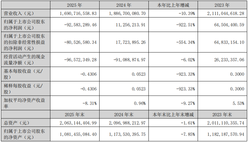 安纳达于3月25日发布2025年年度报告。报告显示,公司2025年实现营业收入16.91亿元,同比下降10.39%;归属于上市公司股东的净利润为-9258.33万元,较上年同期的1125.62万元大幅下滑922.51%。