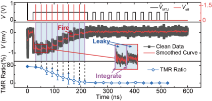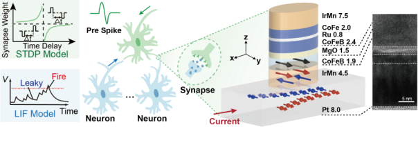 近日,《自然·通讯》(Nature Communications)期刊在线发表了北航集成电路科学与工程学院赵巍胜教授课题组的最新科研进展《Nanoscale exchange-bias magnetic tunnel junctions enabled memristive synapse and leaky-integrate-fire neuron for neuromorphic computing》。该研究基于交换偏置磁隧道结器件,首次在百纳米尺度实现了稳定且可调控的多阻态特性,实现了可通过自旋轨道矩(Spin-Orbit Torque, SOT)连续调控且长期稳定保持的超过25个可分辨阻态,并在此基础上实现人工神经元与突触功能的同片集成,为自旋电子神经形态计算提供了新的实现方案。