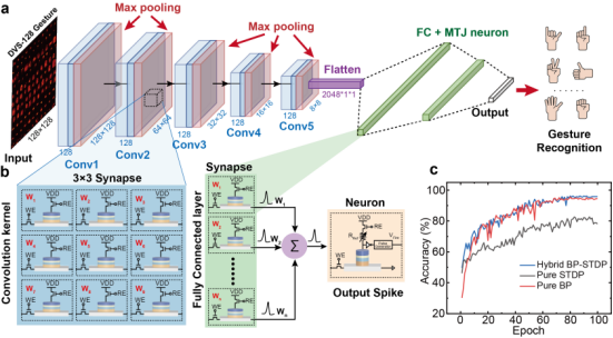 图4 a,b. 全自旋电子学的CSNN实现手势识别任务