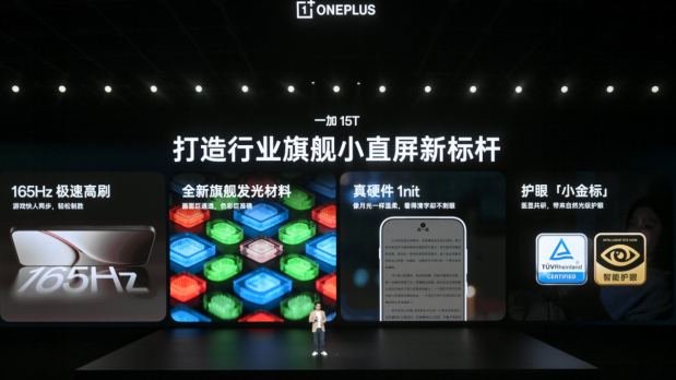 屏幕层面,一加15T搭载6.32英寸165赫兹旗舰小直屏,采用全新旗舰发光材料,经自研屏幕科学产线二次校准,色彩精准通透。支持1尼特硬件暗夜显示,深夜使用不刺眼;搭载医显共研明眸护眼技术,七大AI护眼功能加持,斩获小屏领域唯一护眼小金标,长时间使用更舒适。影像系统上,该机配备5000万像素索尼IMX906主摄,支持OIS防抖与全像素全向对焦,同时搭载小屏罕见的5000万像素3.5倍潜望长焦,覆盖85毫米黄金人像焦段,支持7倍无损光学变焦,远景近景皆清晰。
