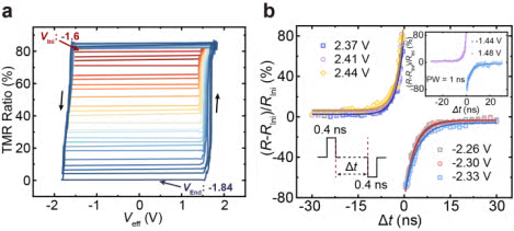近日,《自然·通讯》(Nature Communications)期刊在线发表了北航集成电路科学与工程学院赵巍胜教授课题组的最新科研进展《Nanoscale exchange-bias magnetic tunnel junctions enabled memristive synapse and leaky-integrate-fire neuron for neuromorphic computing》。该研究基于交换偏置磁隧道结器件,首次在百纳米尺度实现了稳定且可调控的多阻态特性,实现了可通过自旋轨道矩(Spin-Orbit Torque, SOT)连续调控且长期稳定保持的超过25个可分辨阻态,并在此基础上实现人工神经元与突触功能的同片集成,为自旋电子神经形态计算提供了新的实现方案。
