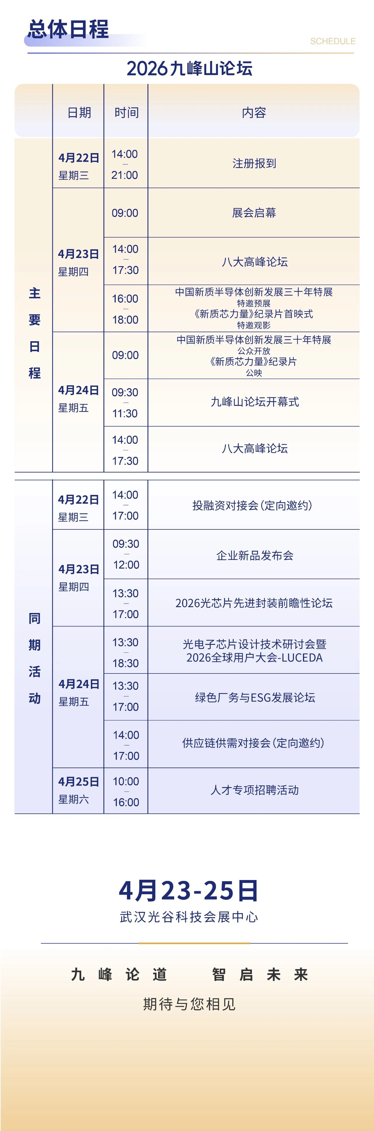 4月23日,武汉见!九峰山论坛2026展会启幕! 作者: 爱集微 2小时前 相关舆情 AI解读 生成海报 来源:九峰山论坛 #九峰山论坛# #半导体# 评论 收藏 点赞 2517 点击或扫码进行观众登记 责编: 爱集微 来源:九峰山论坛 #九峰山论坛# #半导体# 收藏 点赞 分享至: 微信扫一扫分享 THE END 相关推荐 3000万美元!无锡锡山签约高纯半导体材料项目,计划8月开工 拓芯章·见未来|拓荆科技SEMICON China 2026新品发布会圆满落幕 持续产品多维度创新迭代 新款TOPSwitchGaN IC将输出功率提升一倍以上,同时降低系统成本、简化系统结构并缩短设计周期 青禾晶元完成约5亿元战略融资,中微公司领投,加速键合集成技术产业落地与规模化发展 悦芯科技完成超12亿元pre-IPO轮融资,系半导体测试设备商 特朗普拟设立4万亿美元全球半导体投资基金,美政府仅出资2.5亿美元 +关注 爱集微 微信: 邮箱:laoyaoba@gmail.com 12.8w文章总数 12012.5w总浏览量 最近发布 恩智浦第三代雷达收发器助力高性能成像雷达规模量产,赋能L2+至L4级自动驾驶 58分钟前 再获国家级最高认证!荣成歌尔通过CMMM L4级认证 1小时前 泰凌真8K方案刷新低时延交互体验,Sidewalk解决方案拓展物联边界 1小时前 小而强大,全面出彩,一加15T搭载第五代骁龙8至尊版拓展小屏旗舰体验边界 1小时前 全球首条搭载无FMM技术第8.6代AMOLED生产线举行清扫仪式 1小时前 获取更多内容 最新资讯 从单品冠军到平台化先行者:盛美上海“八大行星”系列亮相SEMICON China 2026 5小时前 恩智浦第三代雷达收发器助力高性能成像雷达规模量产,赋能L2+至L4级自动驾驶 58分钟前 再获国家级最高认证!荣成歌尔通过CMMM L4级认证 1小时前 泰凌真8K方案刷新低时延交互体验,Sidewalk解决方案拓展物联边界 1小时前 小而强大,全面出彩,一加15T搭载第五代骁龙8至尊版拓展小屏旗舰体验边界 1小时前 雷军晒成绩:小米SU7、YU7双双第一! 1小时前