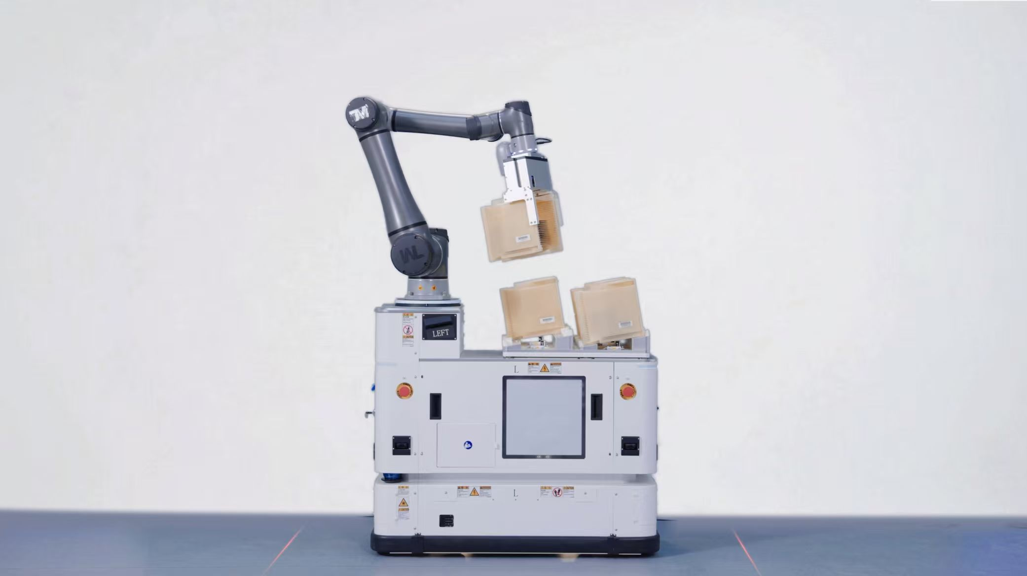 在优艾智合展台,三台移动操作机器人正在模拟的半导体工厂环境中协同作业。从取料到运输再到对接放料,一整套完整的物料智能化流转闭环跃然眼前。