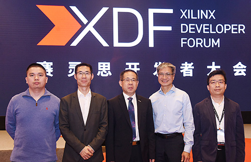 图4 XDF合作伙伴合影:阿里巴巴异质运算总监项午(左),阿里云FPGA研发总监张振祥(左二),浪潮集团副总裁李金(中),赛灵思CEO Victor Peng(右二),华为智能计算业务副总裁张小华(右)