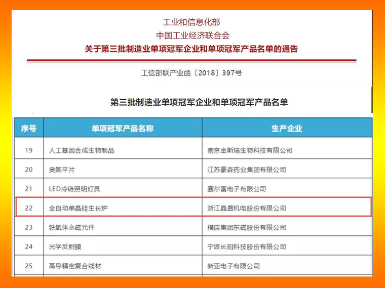 2.晶盛机电全自动单晶硅生长炉入选“第三批制造业单项冠军产品”名单;