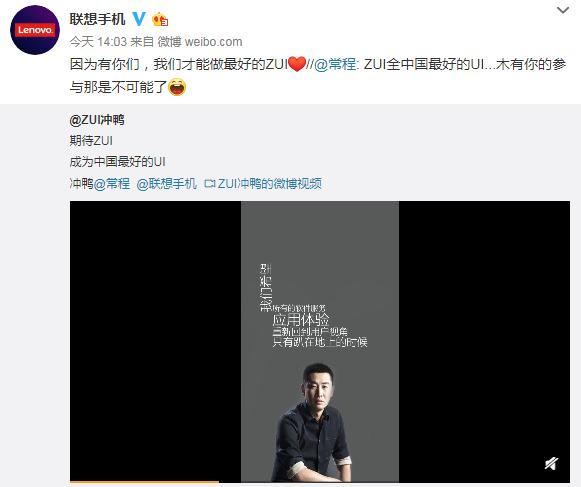 有位联想粉丝发短视频称期待ZUI成为中国最好的(系统)UI,联想集团副总裁常程转发该微博称要达成该目标需要网友们的共同努力才行,联想手机官微也进行了类似的表态。