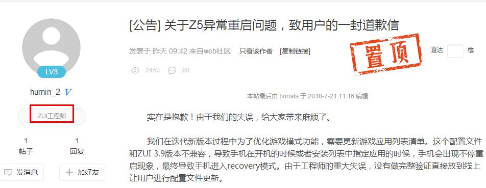 此外,在今年7月份联想官方给旗下的Lenovo Z5手机推送了ZUI3.9.108稳定版导致不少用户在更新完官方推送的系统升级包之后,陷入了自动重启的麻烦中,因为工程师的粗心大意,没有做配置文件的完整验证就直接放到线上让用户进行配置文件更新,结果导致了手机自动重启门事件的发生。