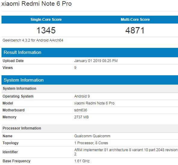 我们在Geekbench上找到了一款运行Android9.0操作系统的红米Note6 Pro,单核跑分1345分,多核跑分4871分,基本跟运行Android8.1操作系统的红米Note6 Pro成绩差不多。所以看起来Android9.0稳定版应该会在一季度结束时推送给用户,在此之前小米应该会发布基于Android9.0深度定制的MIUI10开发版。