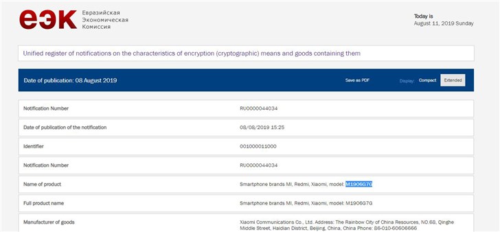 近日,小米新机获俄罗斯eec认证。认证信息显示,该机型号为M1906G7G,根据之前的消息,这款入网俄罗斯的设备有可能是Redmi Note 8。