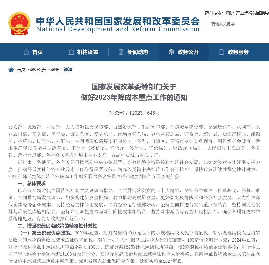 国家发展改革委等部门关于做好2023年降成本重点工作的通知