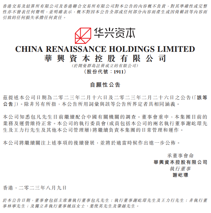 8月9日晚间,华兴资本控股有限公司(简称“华兴资本”)发布公告称,包凡目前继续配合中国有关机构的调查,该集团目前的业务及运营维持正常。