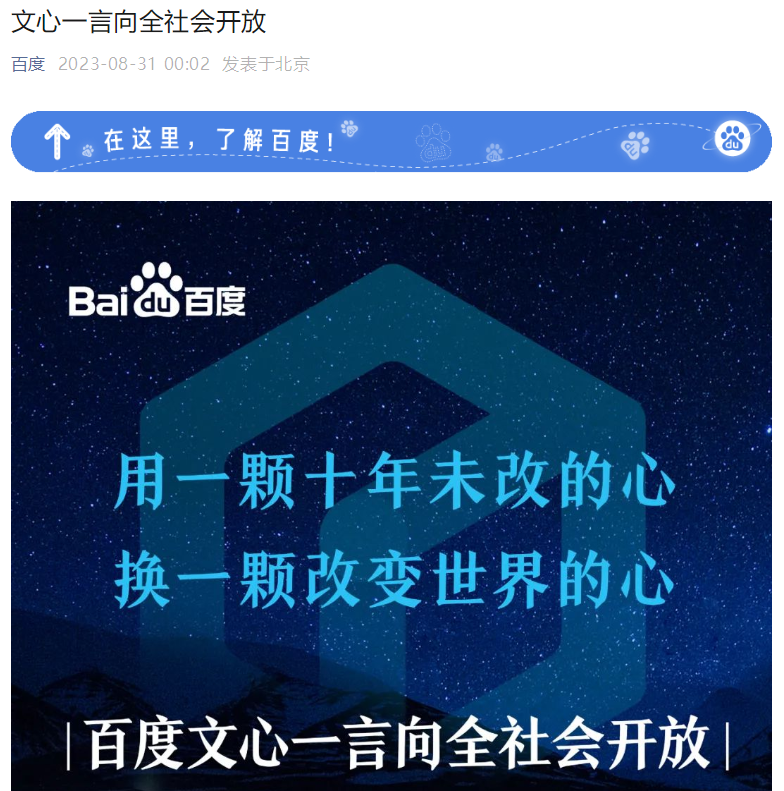 8月31日凌晨,百度官宣“文心一言向全社会开放”。用户可以在应用商店下载“文心一言APP”或登陆“文心一言官网”体验。 百度还将开放一批经过全新重构的AI原生应用,让广大用户充分体验生成式AI的理解、生成、逻辑、记忆四大核心能力。