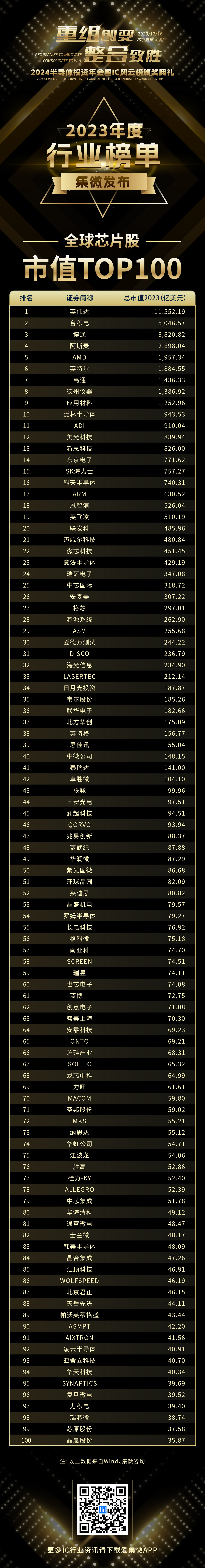 此为“全球芯片股“系列榜单之《全球芯片股—市值TOP100》。