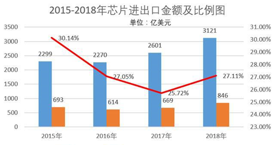 同时,据1月份海关数据显示,2018年我国进口芯片数量达4175.7亿件,同比增长10.8%,而进口金额为3120.58亿美元,同比增长19.8%,同时2018年也是中国芯片进口额首次突破3000亿美元。此外,出口额却是846.36亿美元,进口额是出口额的3.7倍。