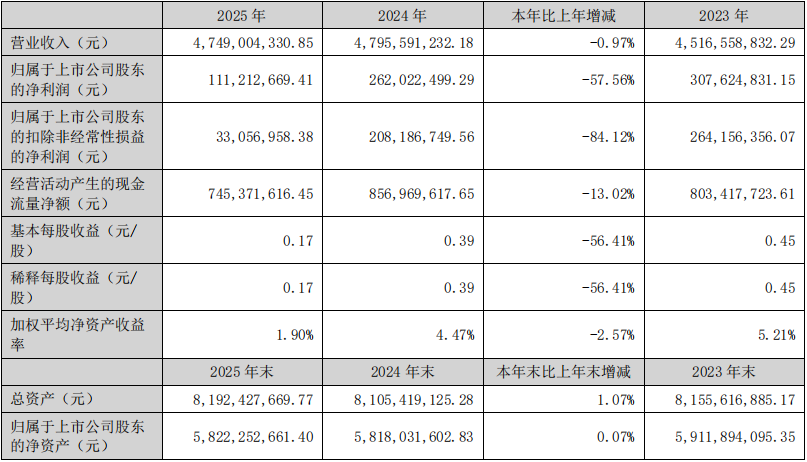 3月27日,苏州安洁科技股份有限公司发布2025年年度报告。报告期内,公司实现营业收入47.49亿元,同比下降0.979%;归属于上市公司股东的净利润为1.11亿元,同比下降57.56%;扣非净利润为3305.7万元,同比下降84.12%;经营活动产生的现金流量净额为7.45亿元。