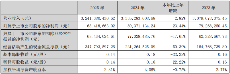 3月30日,深纺织发布2025年年度报告。报告显示,2025年,公司实现营业收入32.41亿元,同比下降2.82%;实现归属于上市公司股东的净利润6841.87万元,同比下降23.44%。扣非净利润为6343.4万元,同比下降17.65%。