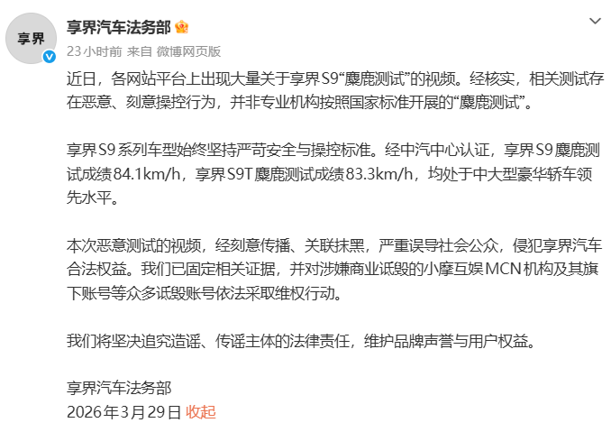 3月29日,享界汽车法务部发布官方声明,披露近期网络上大量传播的享界S9“麋鹿测试”视频存在恶意操控行为,并非专业机构按照国家标准开展的“麋鹿测试”。这些视频经过刻意传播和关联抹黑,严重误导了社会公众,侵犯了享界汽车的合法权益。界汽车法务部同时宣布已对涉嫌商业诋毁的小摩互娱MCN机构及其旗下账号等众多诋毁账号依法采取维权行动。
