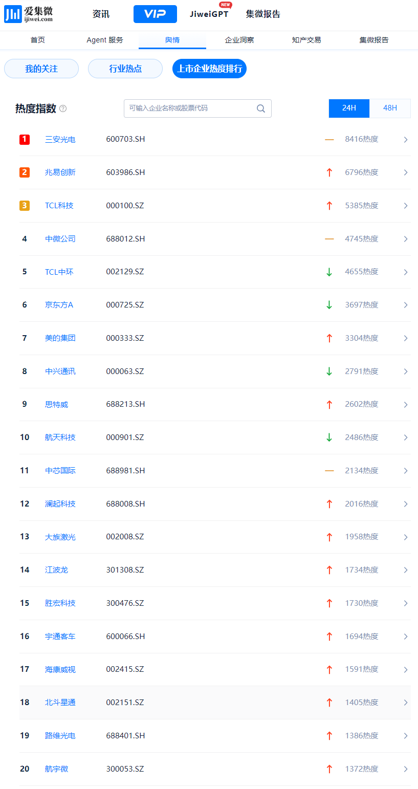 登录爱集微VIP频道,实时查看动态“上市企业热度排行”,穿透洞察每一个波动背后的驱动因素。