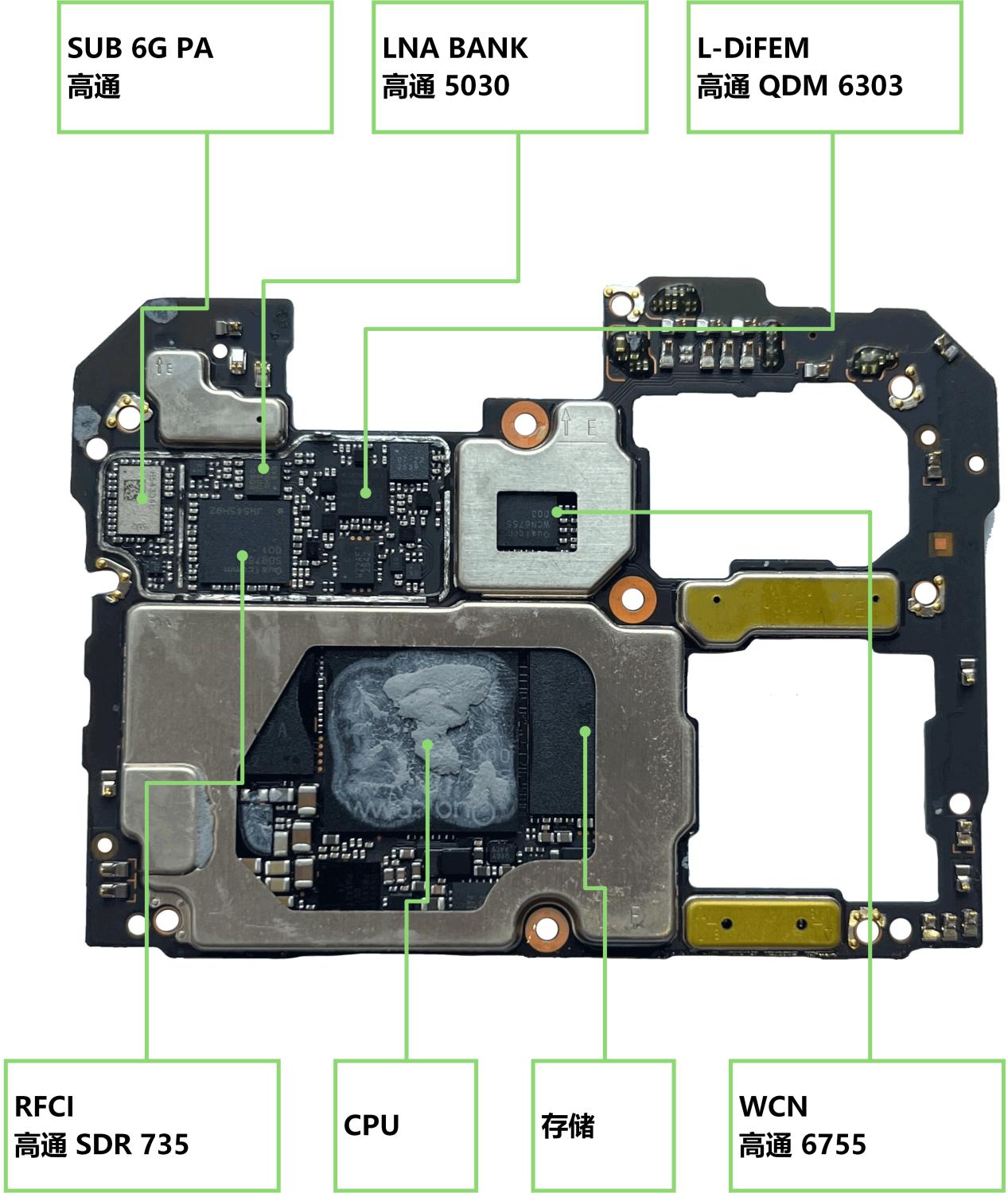 例如,这台以高通体系主导的手机里出现多颗国产滤波器,其中核心频段有3颗来自深圳新声半导体。另外,国产射频前端公司昂瑞微也提供的1颗4G&5G PA和1颗2G PA。