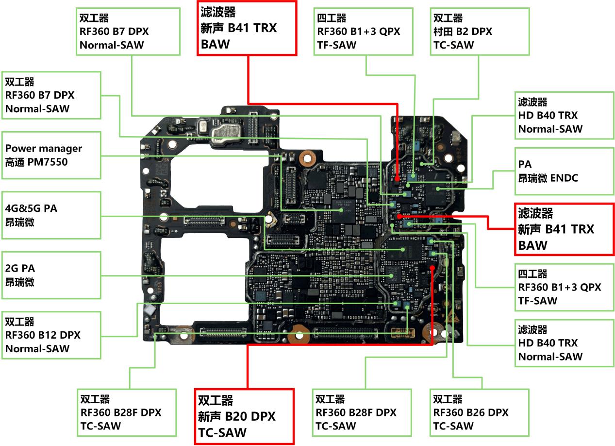除了这颗BAW之外,在中低频段,还能看到新声半导体提供的B20频段TC-SAW双工器,共同构成一套更完整的组合。这种分布并不是简单“补位”,而是不同频段实际工作中的主力器件。