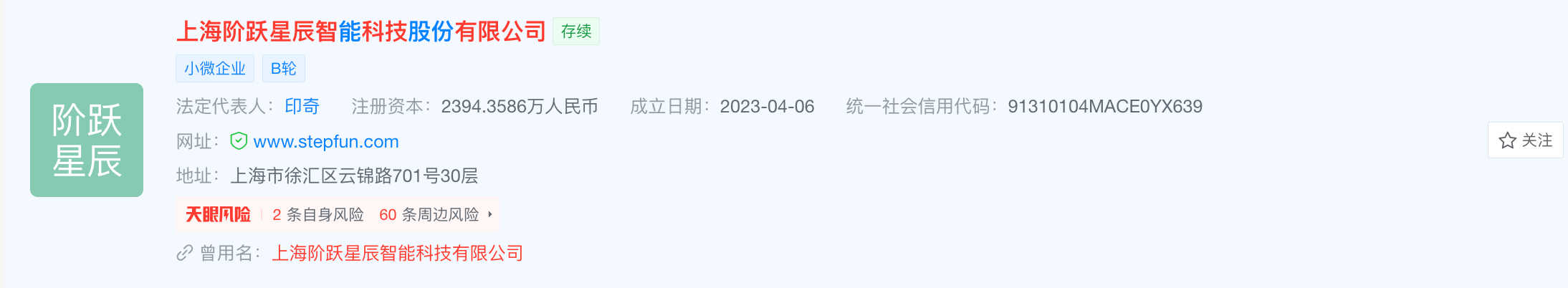 4月3日,天眼查App显示,4月2日,上海阶跃星辰智能科技有限公司发生工商变更,企业名称变更为上海阶跃星辰智能科技股份有限公司。