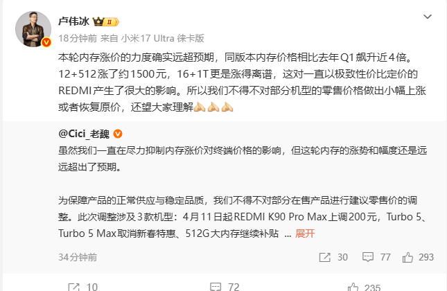 4月3日,小米集团总裁卢伟冰在微博发文表示,因本轮内存价格上涨力度过大,同版本内存价格较去年第一季度上涨近4倍。其中,12+512GB版本内存价格上涨约1500元,16+1TB版本涨幅更为显著。卢伟冰表示,内存价格的大幅上涨,对始终以极致性价比为策略的REDMI影响很大,因此只能对部分机型零售价格进行小幅上调或恢复原价,并向消费者表达理解请求。